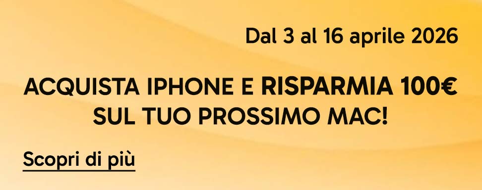 Acquista ora un iPhone e ricevi un buono da 100€ per l’acquisto di un MacBook tra quelli selezionati dal 18 maggio al 10 giugno 2026. Per maggiori informazioni ed esclusioni consulta il regolamento.